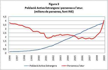 Figura3 mostra l’evolució de l’atur i l’evolució de la Població Activa Estrangera, és a dir, els estrangers amb feina o disposats a treballar a Espanya. Sorprèn, que entre els anys 2001 i 2005 s’incorporessin al mercat laboral Espanyol (treballant o buscant feina) un milió i mig d’estrangers, quan l’atur no baixava de 2 milions de persones. Però sorprèn encara més, que al final d’aquest cicle expansiu, a l’acabar el primer trimestre del 2009, tenim més persones aturades que tots els estrangers actius que han arribat a Espanya els últims 13 anys. És a dir, es demostra que l’economia Espanyola no pot donar feina a tanta gent. Només que ara, estem molt més endeutats que fa 13 anys. Imaginem una família, pares i dos fills, vivint en la mateixa llar. Llar que van comprar fa uns anys, i per la que estan pagant un préstec hipotecari. Tenen més d’un cotxe, però ja amb uns quants anys. Fins fa poc, treballaven els quatre, però fa poc un d’ells s’ha quedat sense feina. La taxa d’atur d’aquesta família és un 25%, no gaire lluny de la taxa d’atur Espanyola al Març de 2009, que era un 17%. Què creieu que farà aquesta família? Acollir-se als ajuts que s’han anunciat fa poc i canviar un cotxe? Canviar de vivenda? El que aquestes famílies estan fent és pagar els rebuts de la hipoteca i, si poden, estalviar alguna cosa per si algú més es queda sense feina. I tot això vol dir reduir les despeses, reduir el consum. I això és precisament el que s’ha de fer per superar una recessió de balanç: estalviar i reduir l’endeutament. Per això, quan sento o llegeixo una noticia explicant els ajuts per canviar de cotxe, em surt: Això no es fa! O quan m’expliquen les facilitats que algunes comunitats autònomes donen per comprar vivendes, em torna a sortir: Això no es fa! I no diguem quan sento els sindicats demanant que les famílies augmentin les seves despeses, em torna a sortir: Això no s’ha de fer!.